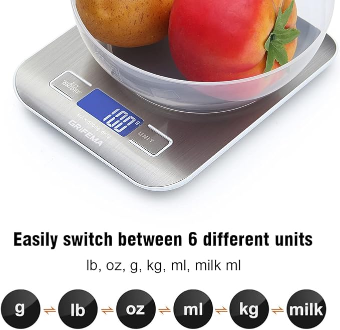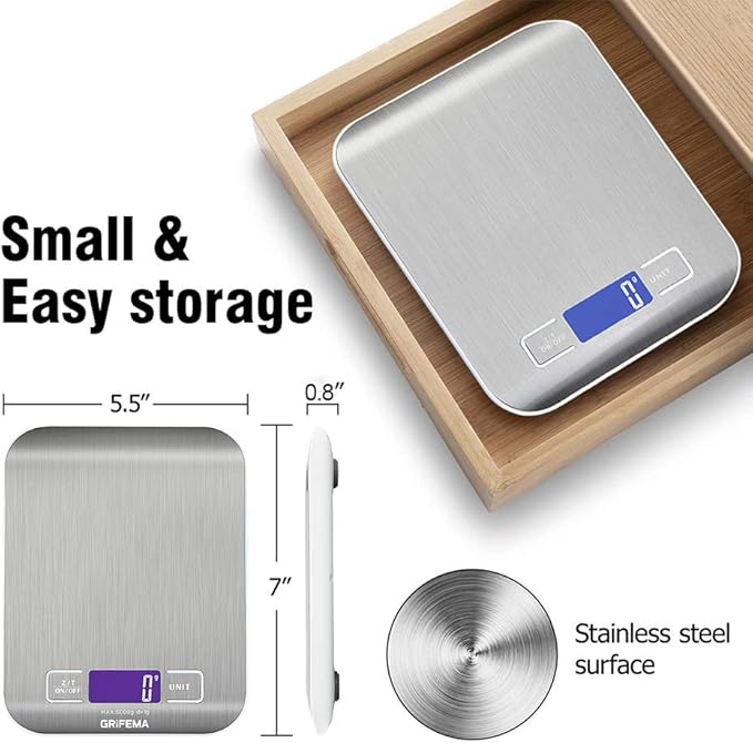 GRIFEMA – GA2002, Báscula de Cocina con Pantalla LCD, Acero Inoxidable, Balanza de Alimentos Multifuncional 5 kg/11 lbs, Color gris: Color de pantalla: Azul [Exclusivo en Amazon]
